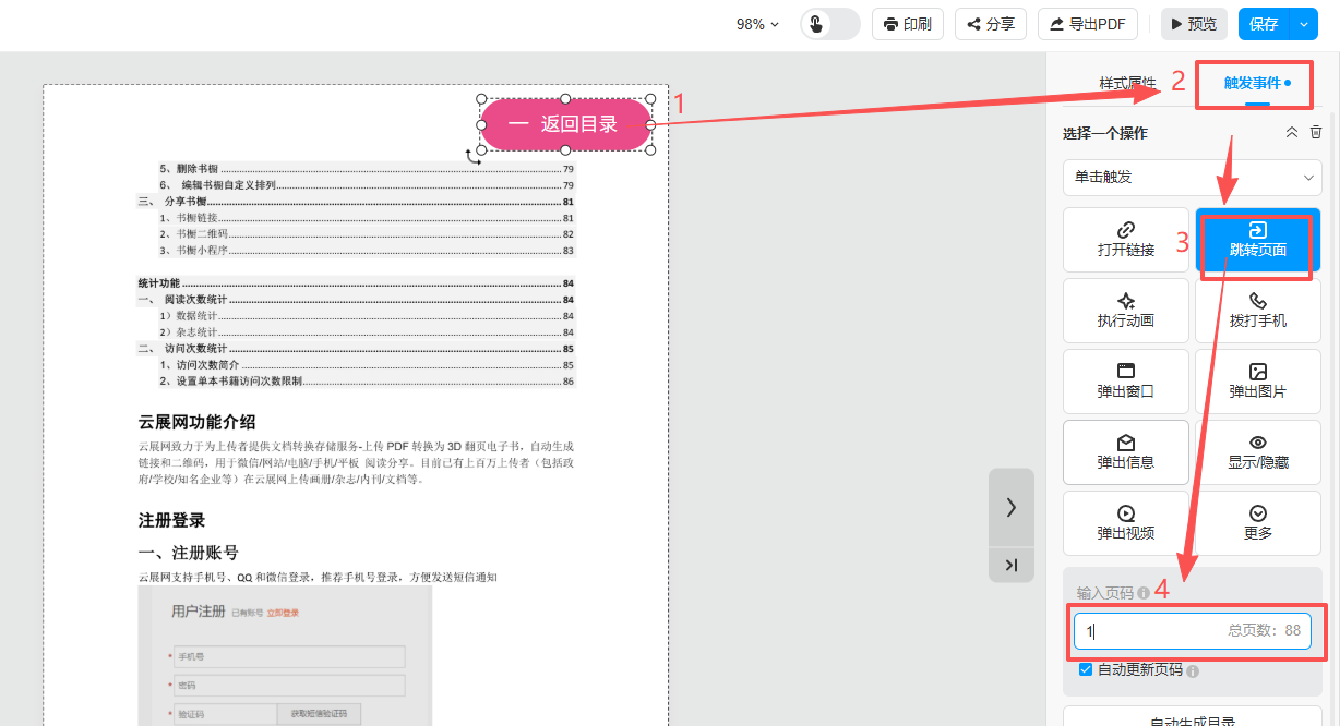 3、点击返回目录按钮,添加【跳转页面】的点击触发事件,跳转页码为目录的那一页。