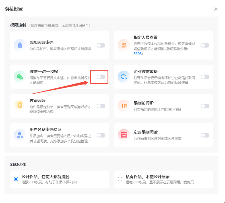 如果你想增强电子书和书橱的安全性和理解潜在用户信息,你可以设置微信一对一授权。
