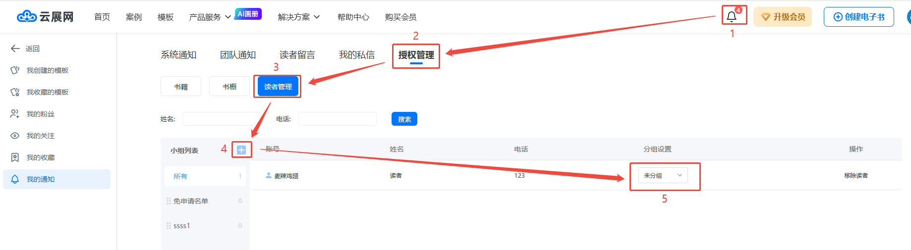 读者申请后,点击右上角的铃铛图标,然后点击【授权管理】,再点击【+】创建小组,最后在对应读者的【分组设置】里进行分组。