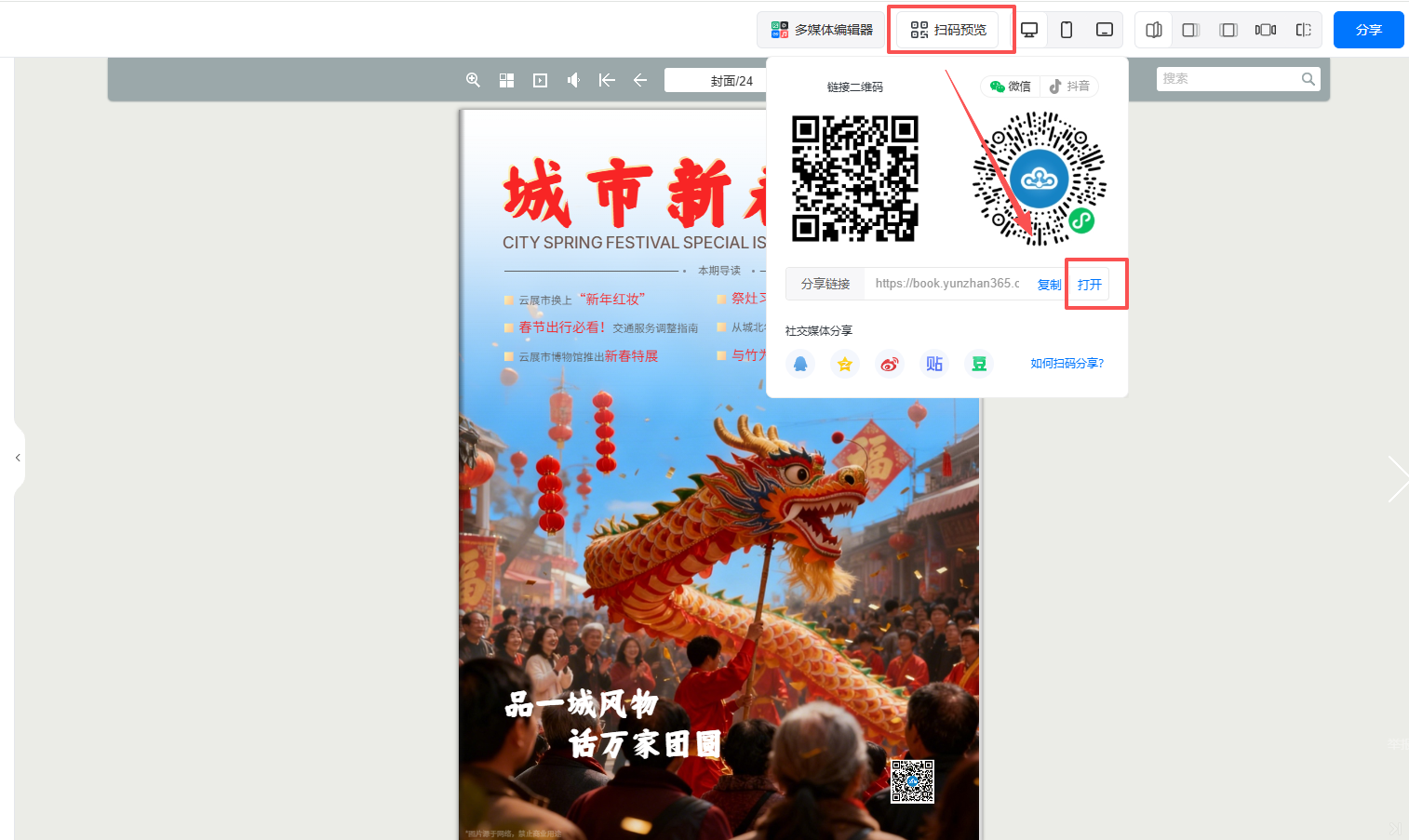 将鼠标悬停在【扫码预览】,选择【打开】查看预览效果。