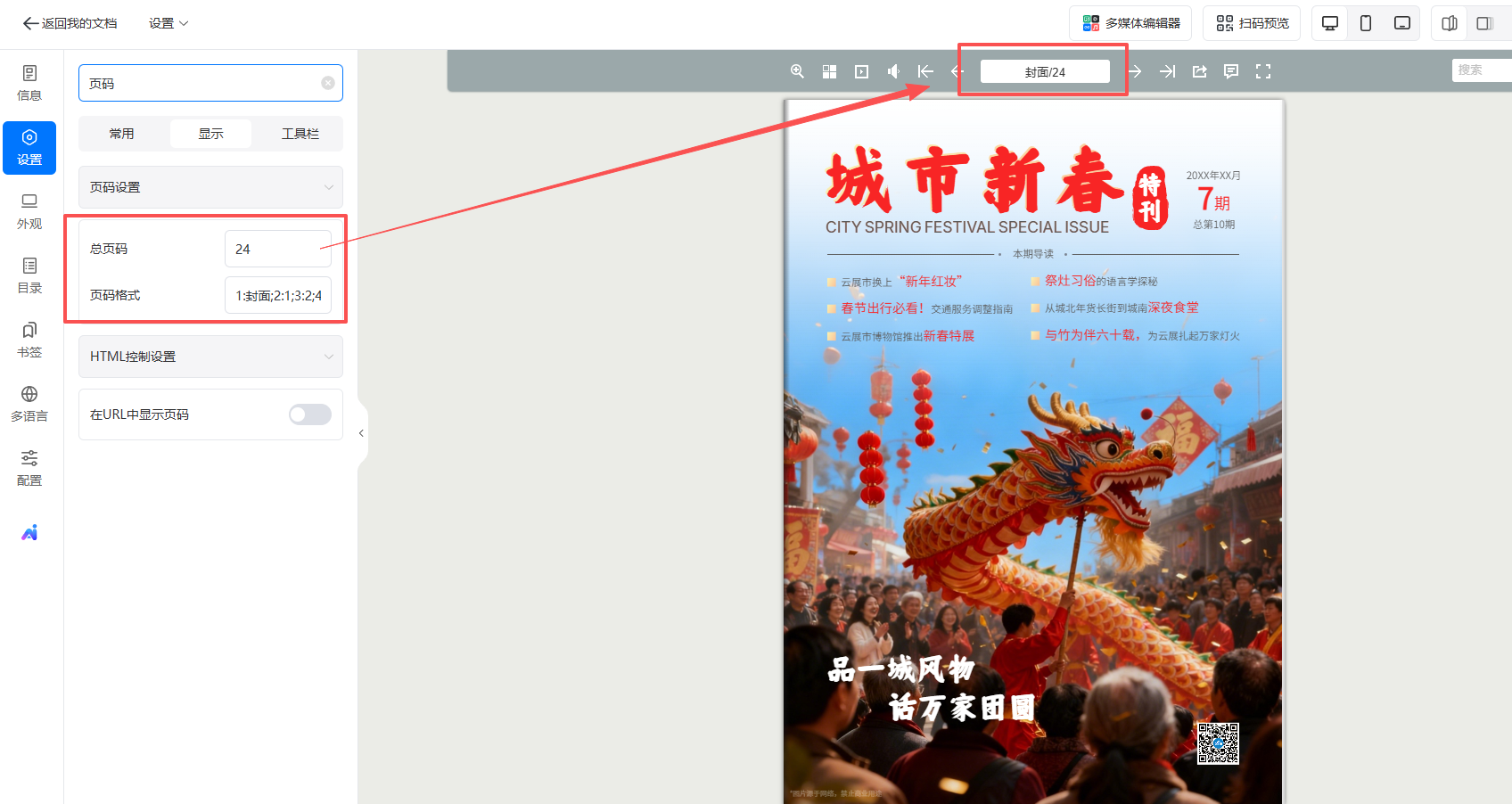 操作步骤:如输入总页码“24”;页码格式“1:封面;2:1;3:2;4:3;5-11:4+;24:封底”,即可如常规书籍一样封面封底显示文字,中间显示页码。