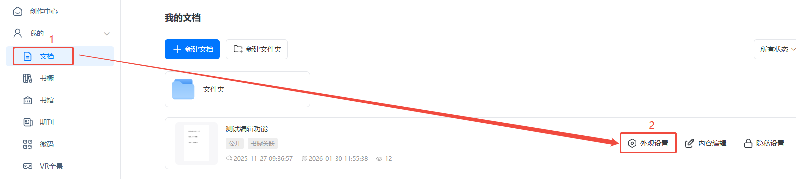 点击【文档】,找到对应电子画册,然后点击【外观设置】。