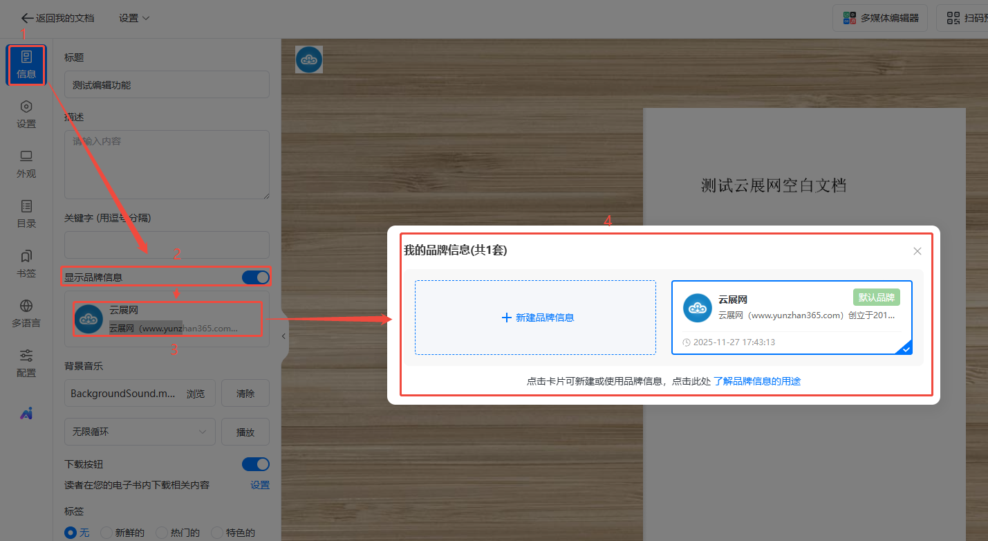 点击【信息】,打开【显示品牌信息】,选择使用一个创建好的品牌信息。