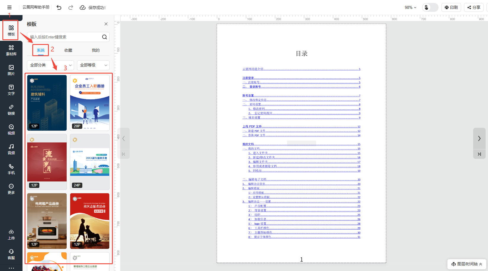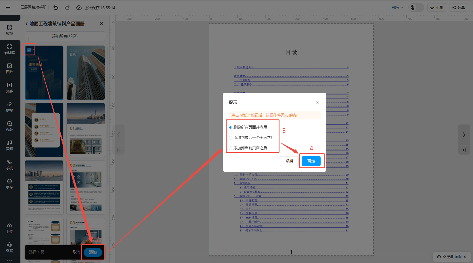 如果你的产品手册/画册需要增加页面,可以在多媒体编辑这里通过插入文档的方式来操作,或者是觉得模板页数少,也可以通过使用其他模板的页面来增加页数。