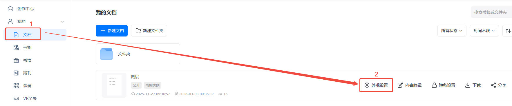 点进【文档】,找到对应电子书,点击【外观设置】。