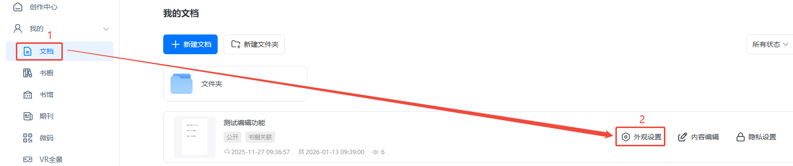 点击【文档】,找到对应的电子画册,点击【外观设置】。