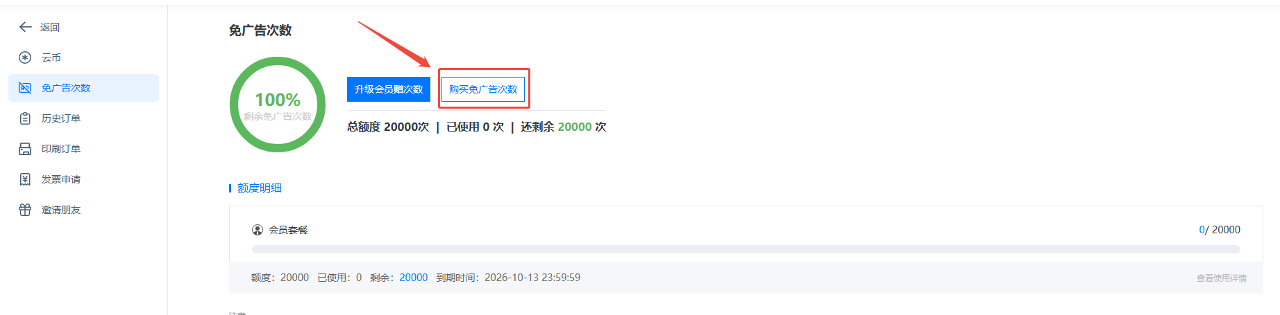 在官网点击右上角头像,再点击【免广告次数】,然后点击【购买免广告次数】,选择需要购买的次数套餐付款后会自动加上。