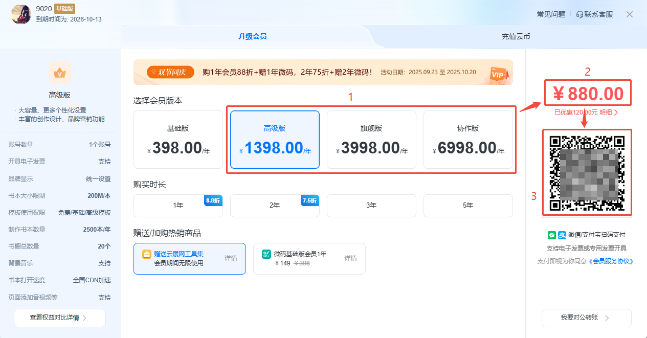 在官网点击右上角头像,点击【升级续费】,选择更高级会员,系统会自动计算差价,付款后自动升级。