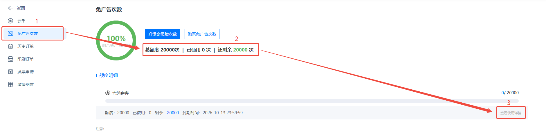 点击【查看使用详情】可以看到每天的免广告次数用了多少, 数据是每一小时更新。