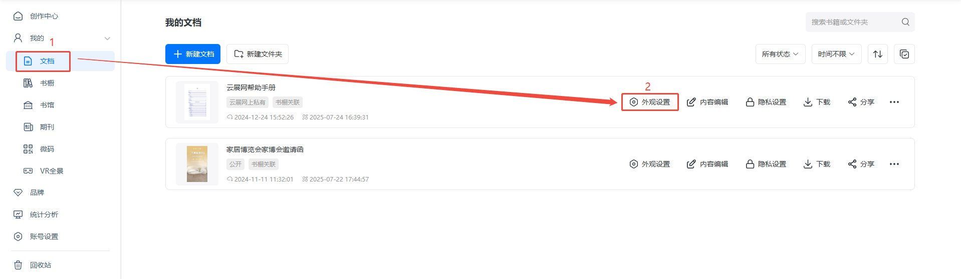点击【文档】,然后点击【外观设置】。