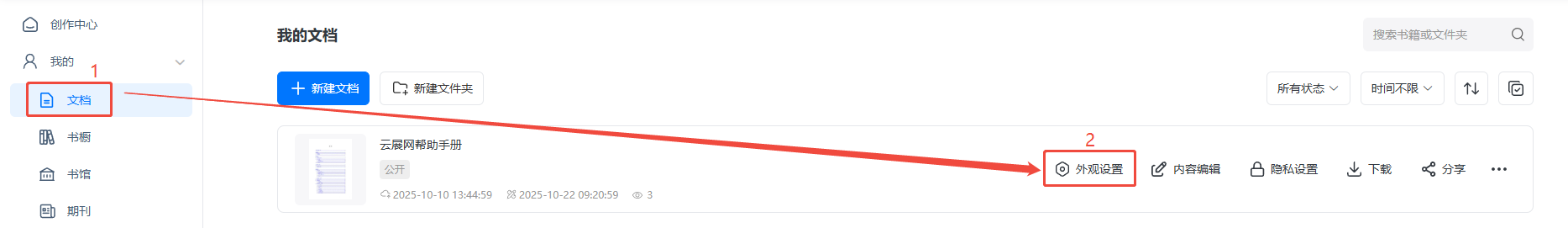 在【文档】找到需要设置的电子书,点击【外观设置】进入。