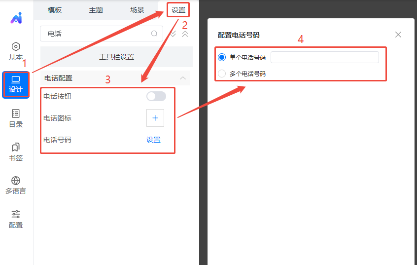点击【设计】,然后点击【设置】,打开【电话按钮】,有需要可以自定义【电话图标】,输入单个电话号码或者多个电话号码。