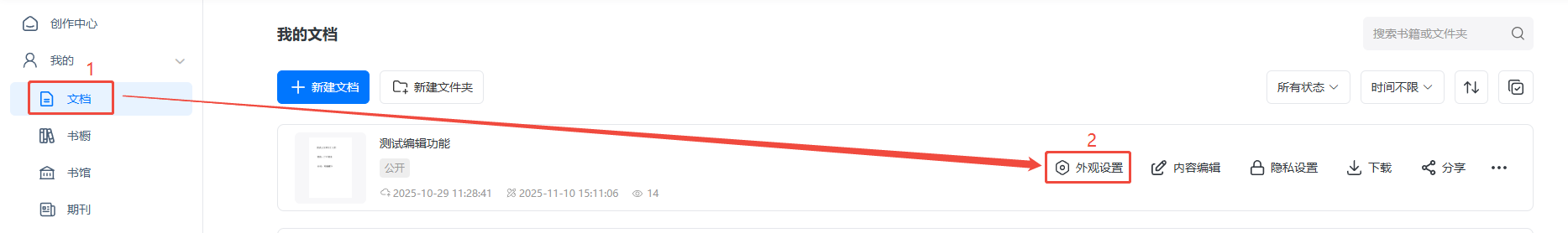 点击【文档】,选择需要设置的电子书,点击【外观设置】。
