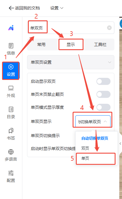 点击【设置】,上方搜索栏搜索【单双页】,【单双页显示】选择【单页】后便会自动保存。