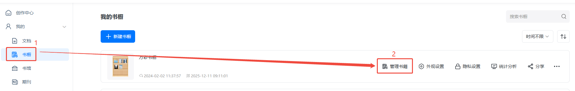 a)点击【书橱】找到对应书橱,点击【管理书籍】,进入管理书橱界面。