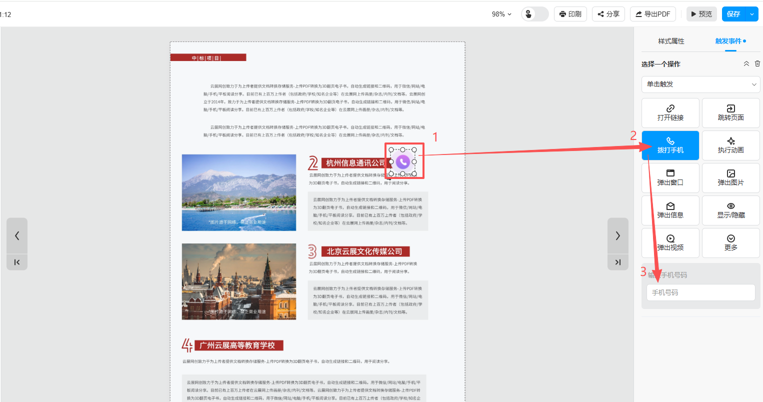 点击页面上的电话按钮,在右边界面属性可以输入希望读者联系的电话号码。