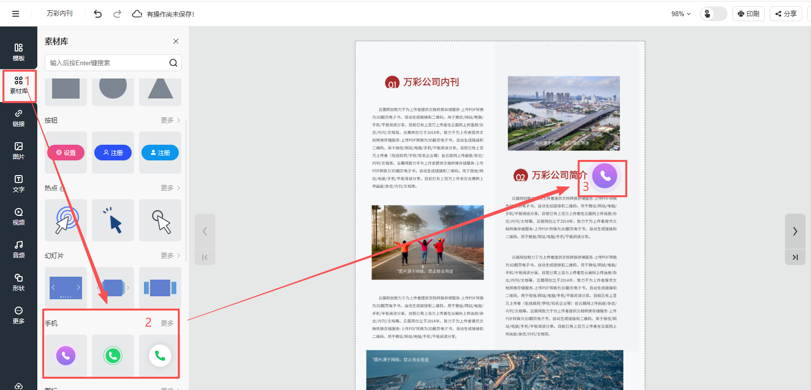 点击【素材库】,点击【手机】,然后选择电话按钮样式,就会有一个电话按钮出现在页面上。