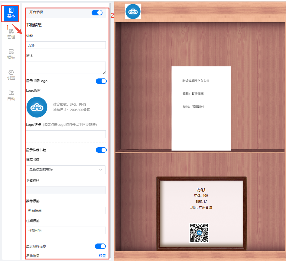 设置书橱的基本信息,包括标题、描述、LOGO、推荐书籍、品牌信息等。