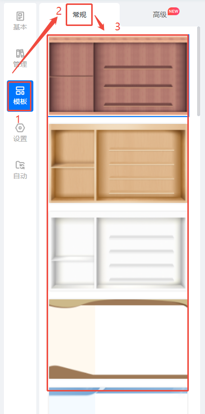 点击【模板】 ,书橱模板分【常规】和【高级】两种,可以根据自己喜好选择。