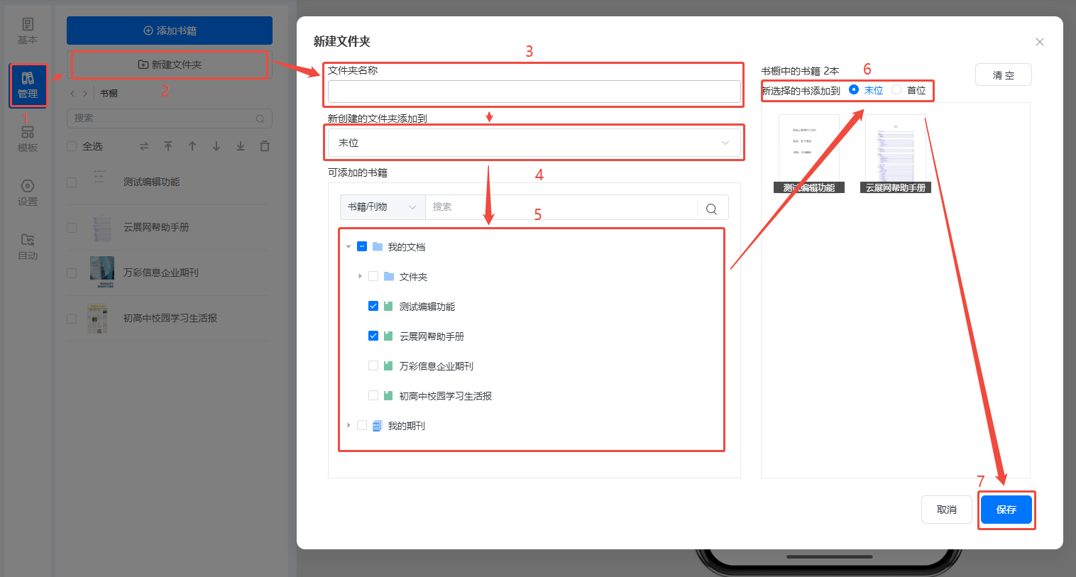 点击【管理】,然后点击【新建文件夹】,输入文件夹名称,选择新创建文件夹添加到书橱末位还是首位,然后勾选需要放置在文件夹上的书,最后点击【保存】。