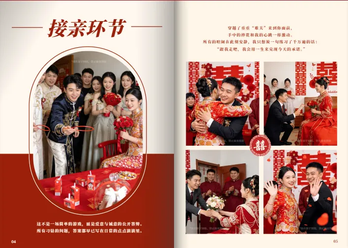细节亮点:按 “晨间准备、接亲环节、敬茶仪式、晚宴时刻” 梳理婚礼流程,沉浸式还原婚礼现场;标题用书法字体,内文用宋体 / 楷体,兼顾传统韵味和阅读性;能添加背景音乐,让电子相册更有氛围感。