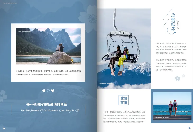 细节亮点:方版设计适配婚纱照排版,避免照片裁剪变形;内页以 “遇见你遇见爱、初遇是你余生都是你”等浪漫主题展开,文字诗意又走心;图片布局有单图大版面、多图组合等,能完美呈现精修婚纱照。